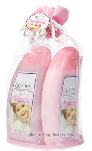 Clear pvc drawstring bag / pvc bag / pvc gift bag for shampoo Material PVC Thickness 0.2mm Colour Clear pvc Size 16.5x24.5cm Printing Silk-screen Moq 3000pcs per model Sampling lead time 5-7 days lk production lead time 20-25 days Packing(three choices) 1.packed into standard export carton 2. one piece in opp bag, than packed into stardard export carton 3.packed into inner boxes, then cartons Price term Exw(ex-works), fob shipping port Delivery port Shenzhen, guangzhou